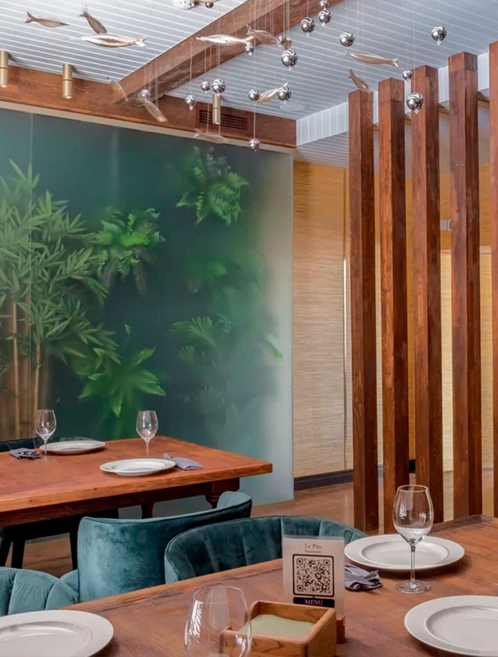 Название ресторана переводится с французского как «сосна» (Le Pin) и было вдохновлено не только прославленными хвойными лесами Бурабайского края, но и одной особенной сосной, растущей непосредственно под окнами нашего ресторана. Её образ мы решили запечатлеть в нашем логотипе.